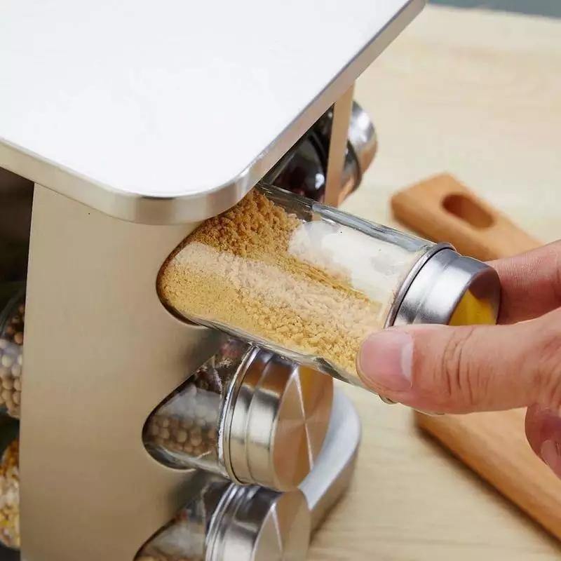 - Rotating Spice rack features a 360-degree rotating design that makes it easy to find ingredients and easy to use when cooking. Allows you to quickly identify the spices and condiments in each glass jar.
